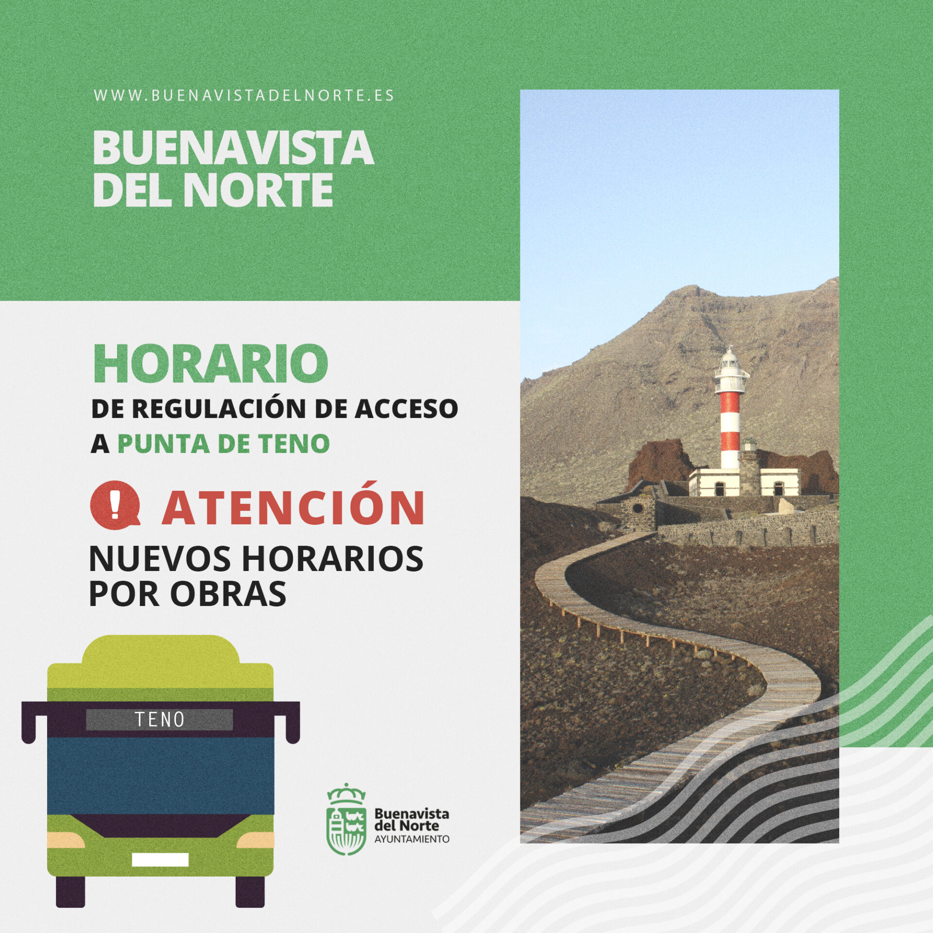 De manera excepcional, debido al comienzo de obras en la carretera que da acceso a Punta de Teno, a partir del lunes, 19 de enero de 2026 y hasta finalización de obras, se producirán cambios en la línea 369 de guagua que realiza el trayecto desde la Estación de Guaguas de Buenavista del Norte hasta Punta de Teno. Puede ampliar información en relación a los horarios en el siguiente link: https://titsa.com/index.php/tus-guaguas/lineas-y-horarios/linea-369